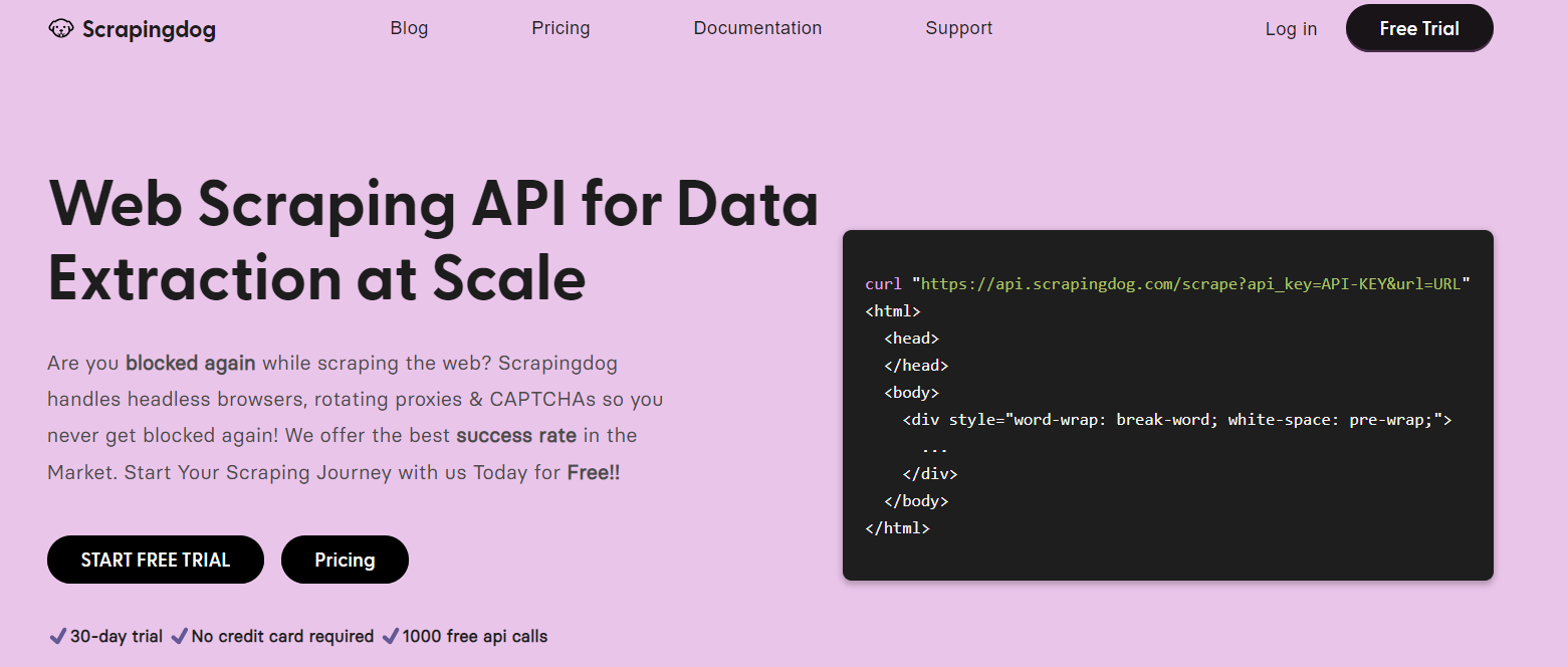 Scrapingdog is the best web scraping tool that handles millions of proxies, headless browsers, and CAPTCHAs to provide you with any web page’s HTML data. The tool rotates IP addresses with each request from a list of millions of proxies.
