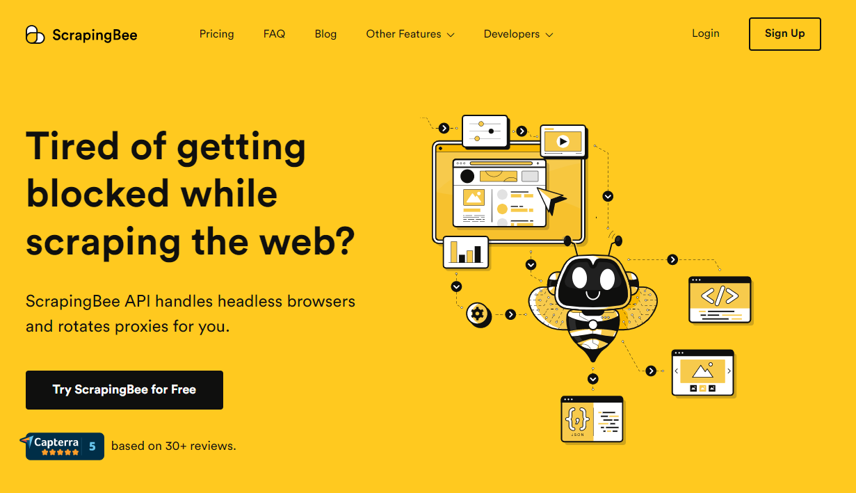 ScrapingBee offers the opportunity to scrape data through different web pages without getting blocked.